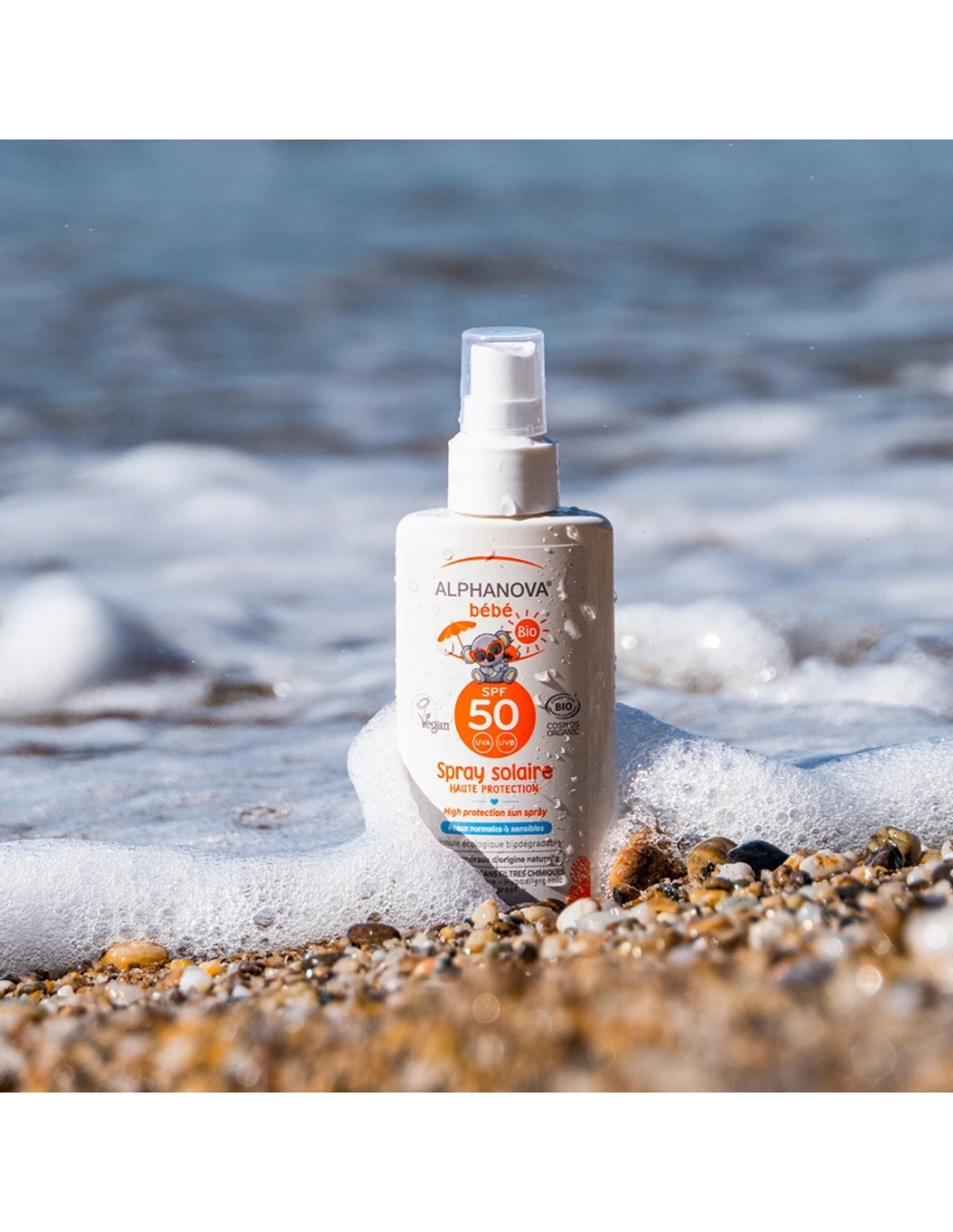 O Alphanova Bebe Spray Protetor Solar SPF50 combina eficácia protetora com uma fórmula 100% natural, suave e segura para a pele dos bebés. Utiliza exclusivamente filtros minerais não nano – óxido de zinco e dióxido de titânio – que formam uma barreira física na superfície da pele, refletindo os raios solares ao invés de os absorver. Esta ação proporciona uma proteção imediata, sem necessidade de absorção cutânea, evitando assim reações adversas comuns nos filtros químicos.