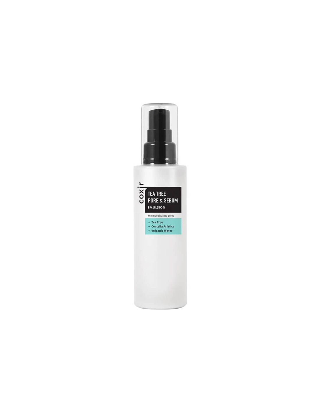 Coxir Tea Tree Pore and Sebum Emulsion tem uma textura leve, não oleosa e de rápida absorção. Formulado com Tea Tree (árvore do chá), centelha asiática e água vulcânica.