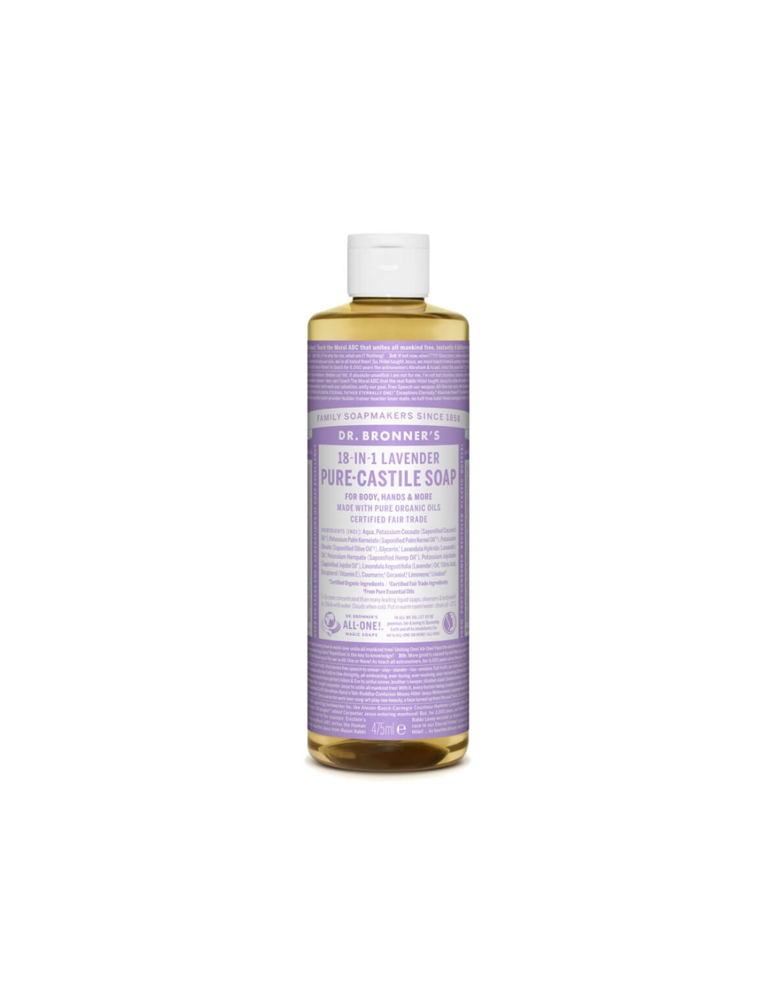 Dr. Bronner´s Sabonete Líquido é um sabonete ultra concentrado biodegradável e de base vegetal. Formulado com óleos certificados biológicos e de comércio justo. Limpa suavemente sem secar a pele. Sabonetes liquido super concentrado, versátil e amigo do ambiente. São completamente biodegradáveis e de base vegetal, sendo feitos com óleos certificados biológicos e de comércio justo. Limpa suavemente a pele. A versatilidade dos sabonetes Dr. Bronner’s permite diversas utilizações. Pode utilizar como champô, gel de banho, massagem, creme barbear, banho de espuma, champô para animais de estimação, para o banho do bebé e limpeza do lar e roupa. A fragrância a alfazema, proporciona uma sensação de relaxamento ao corpo e mente.