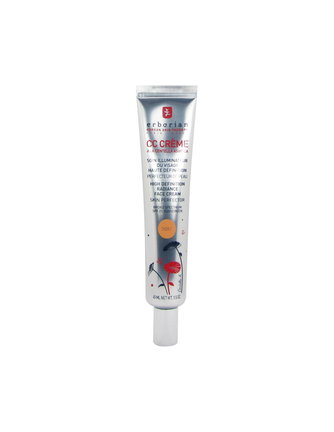 Erborian CC Cream é um creme com cor (CC - color corrector), com pigmentos encapsulados que ao serem aplicados na pele, adquirem o “tom ideal” e ajuda a corrigir e camuflar imperfeições. Com uma cobertura leve a média modulável e acabamento natural luminoso, uniformiza o tom da pele, sublimando a tez. Confere luminosidade, proteção de SPF25 e hidratação, enquanto uniformiza e disfarça as rídulas causadas pela desidratação. Cor doré (médio).