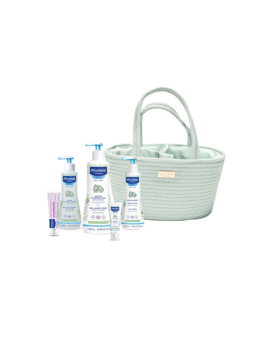 Esta cesta reúne os cinco produtos mais icónicos da Mustela, indispensáveis para o cuidado diário: