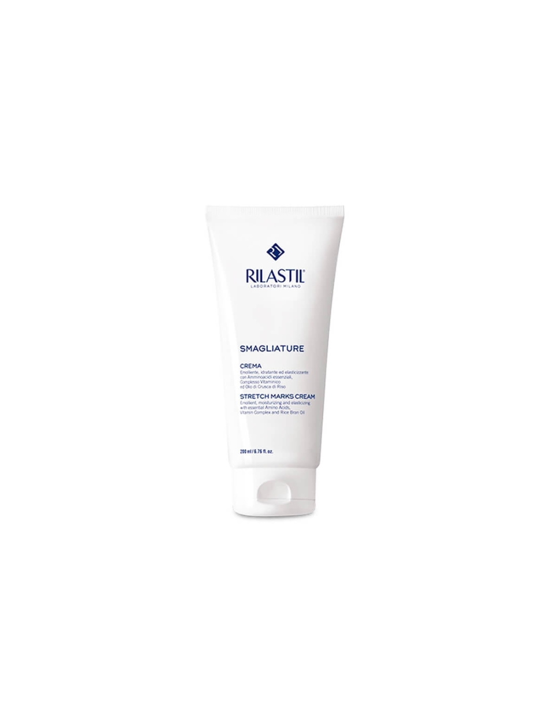 Rilastil Smagliature Creme Para Estrias tem uma textura rica e emoliente, que permite massajar a pele para uma ação antiestrias. Formulado com aminoácidos essenciais, complexo vitamínico e óleo de farelo de arroz, que em sinergia ajudam a melhorar as qualidades de elasticidade e de firmeza da pele.