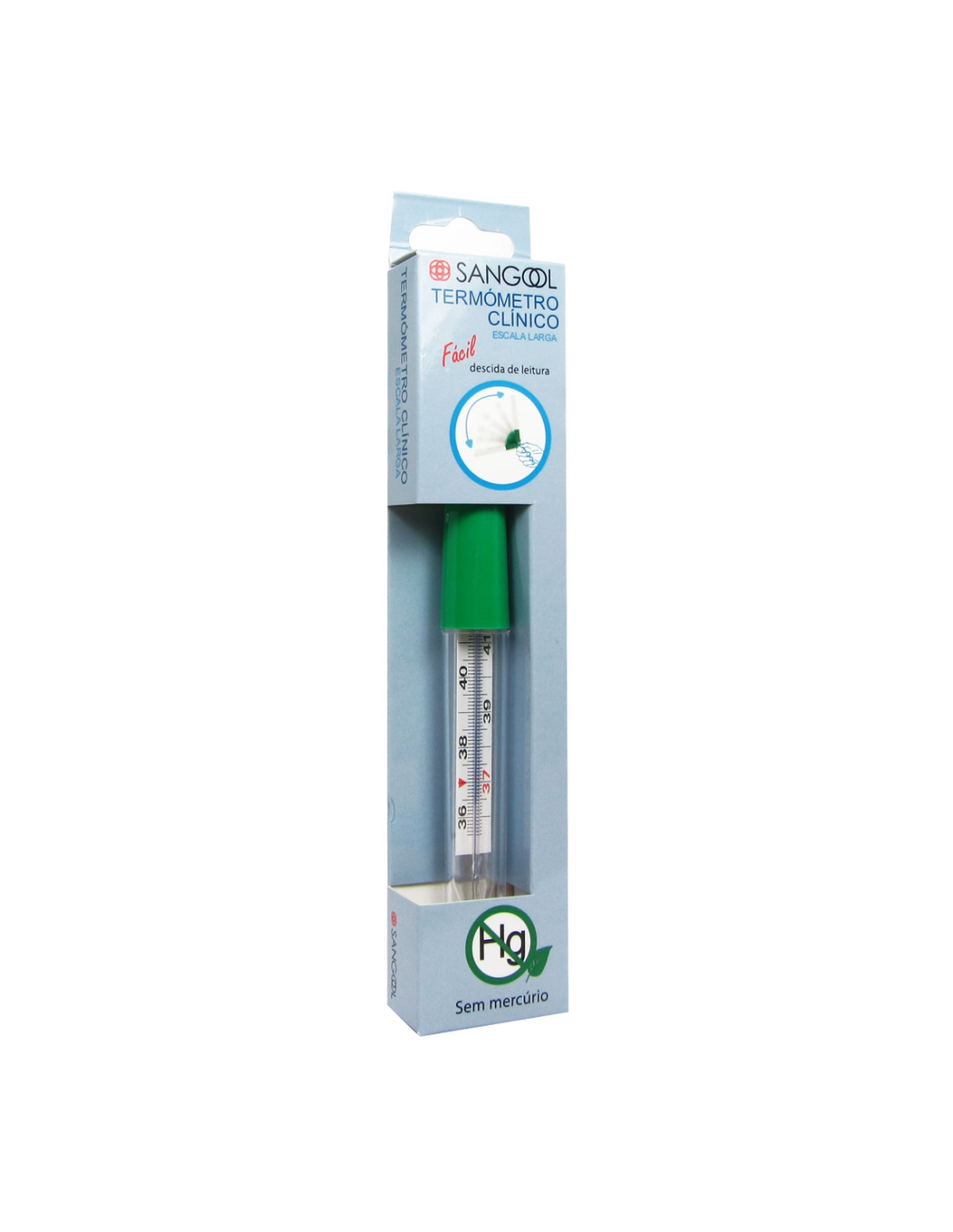O termometro ecológico de leitura manual Sangool foi elaborado com uma mistura de gálio, Zinco e Estanho. Não tóxico e amigo do ambiente, permite medir a temperatura corporal sem utilizar bateria.